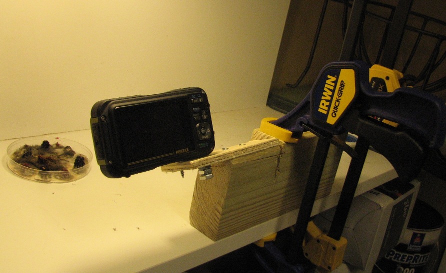 I used a Pentax Optio W90 which seems to be a great camera for shooting time-lapses. It has a built in intervalometer with lots of flexibility in settings. Also it is weather resistant and can be used outside or underwater. It has two macro settings with one of them for use at 1cm. The intervalometer function can be used with multiple settings such as auto flash and macro. To get around the camera's limited battery life, I ordered an extra Pentax D-Li88 rechargable battery that allows me to switch them out periodically and let one charge while the other is being used. Charge time is about 2 hours or less. With my setup, I attached the camera to a sturdy block, with the opening for changing batteries off to the side so I could change the battery every 3-5 days without moving the camera at all. Here is the video.